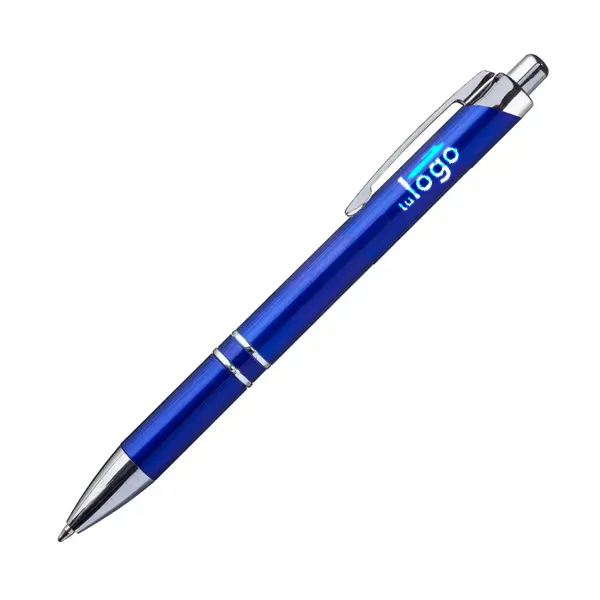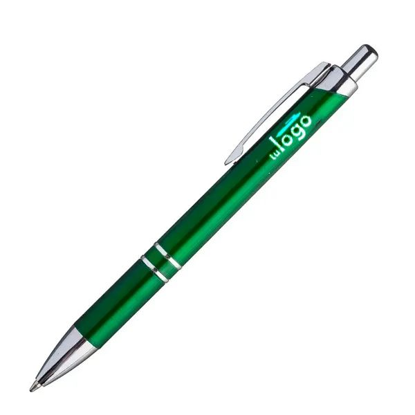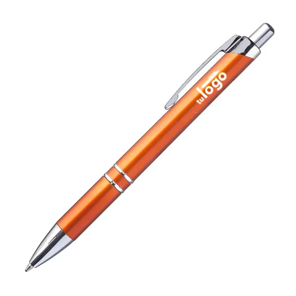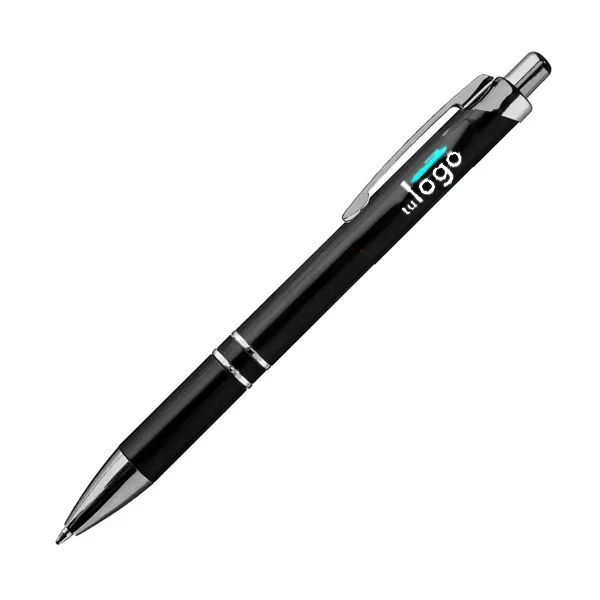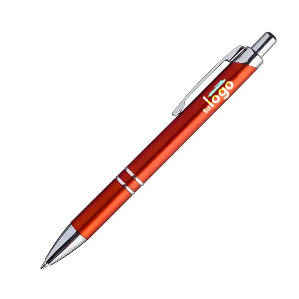 De delicadas líneas, este bolígrafo tiene dos aros metalizados brillantes cerca del grip, que lo hacen un bolígrafo ideal para obsequios de promoción elegantes. La impresión se realiza por proceso tampográfico o full color con tintas UV . El área máxima de impresión de este bolígrafo (o birome) es de 7 mm. de alto x 60 mm. de largo.