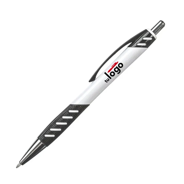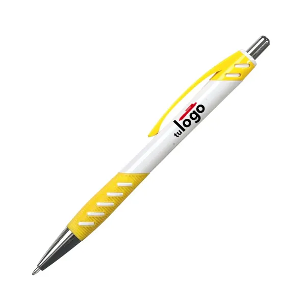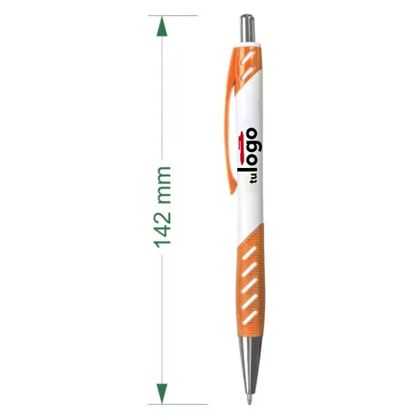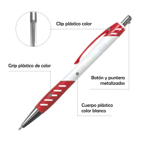 El cuerpo es de plástico de color blanco con grip y clip de color. Posee botón y puntera metalizados en color plateado. Se imprimen full color. Nuestros Bolígrafos Fox tienen tanque de tinta tipo “Parker” y color de escritura negro.
