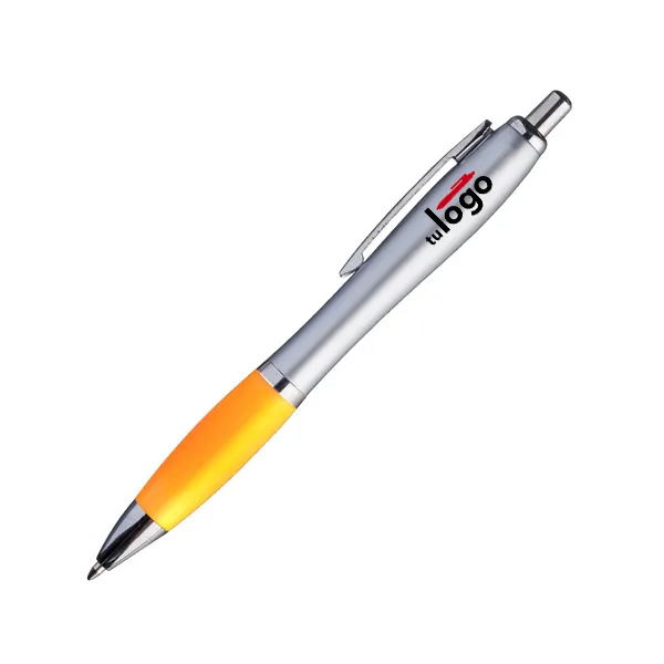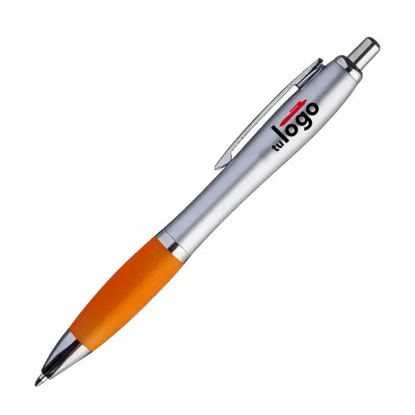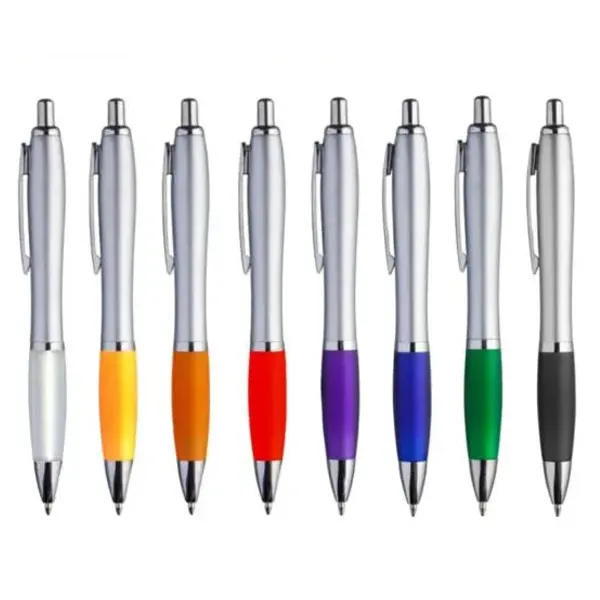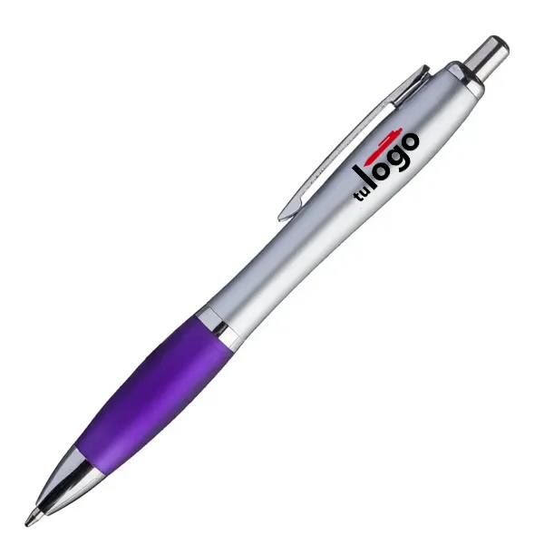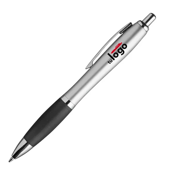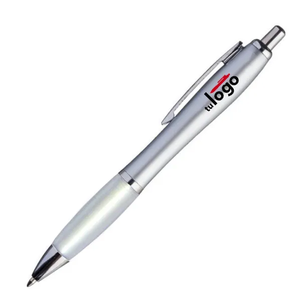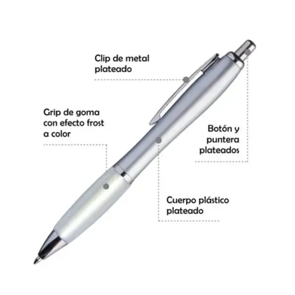 El Bolígrafo Jade Plata es plástico de alta gama. El botón y la puntera son metalizados en color plateado. El cuerpo es de plástico metalizado plateado. El grip de estos bolígrafos es de plástico color efecto frost. El clip es de metal plateado. Se imprimen por proceso tampográfico o impresión UV. El bolígrafo Jade Plata tiene tanque de tinta tipo “Parker” y color de escritura negra.