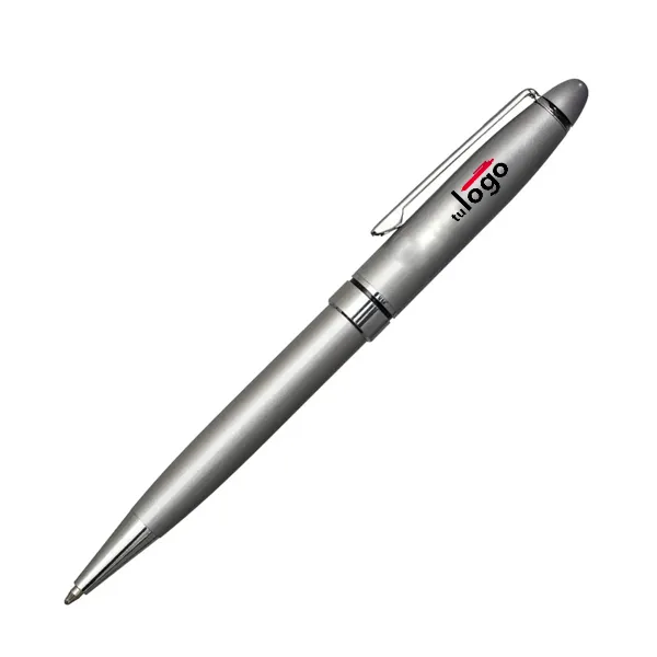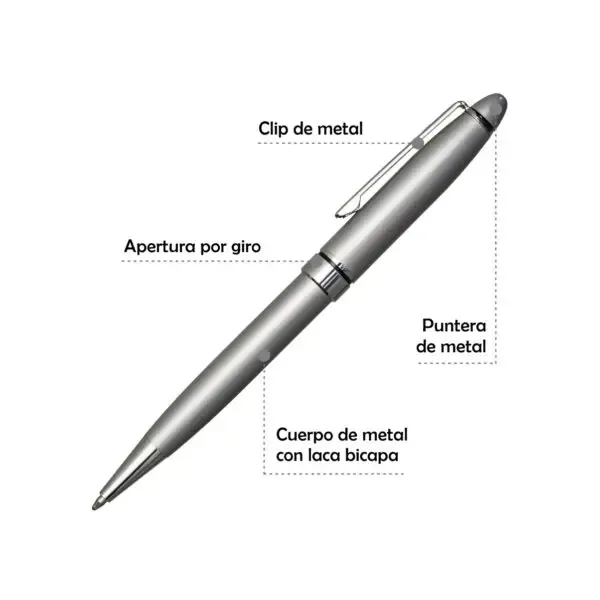 El Bolígrafo Modelo MB es un Bolígrafo metálico de alta gama, “tipo pesado” . Posee tanque de tinta negra estilo“Parker”. Su botón y puntera son de metal plateado y el cuerpo es de metal con laca bicapa. Se imprimen por proceso tampográfico en color plateado.