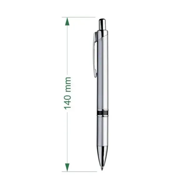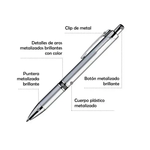 Bolígrafo retráctil de cuerpo metalizado con botón y clip metalizados brillantes. La impresión se realiza por proceso tampográfico o impresión full color con tintas UV.. El área máxima de impresión de este bolígrafo (o birome) es de 7 mm. de alto x 60 mm. de largo y el color de la tinta de escritura es negro.