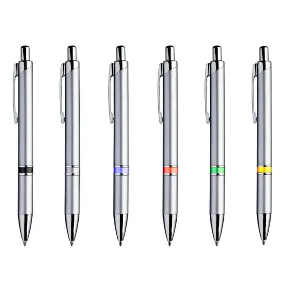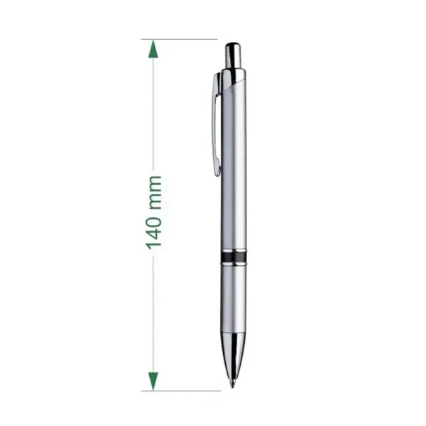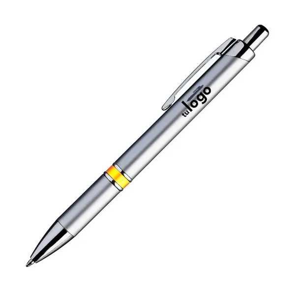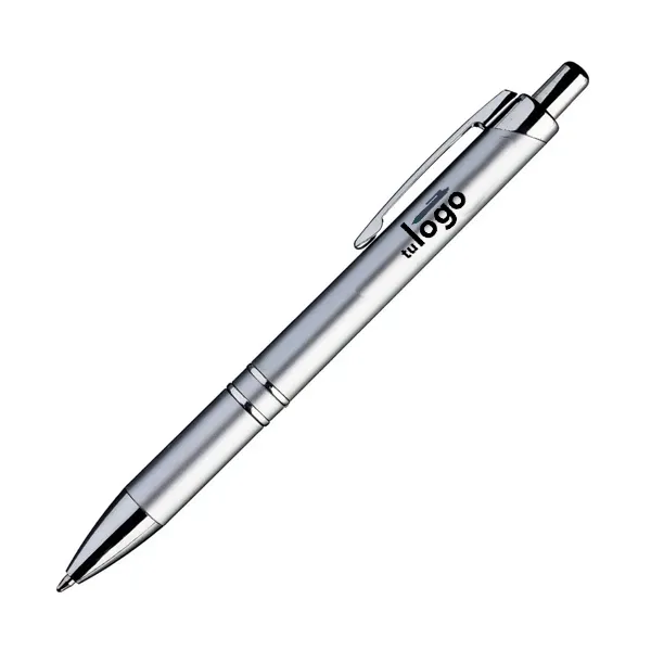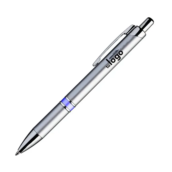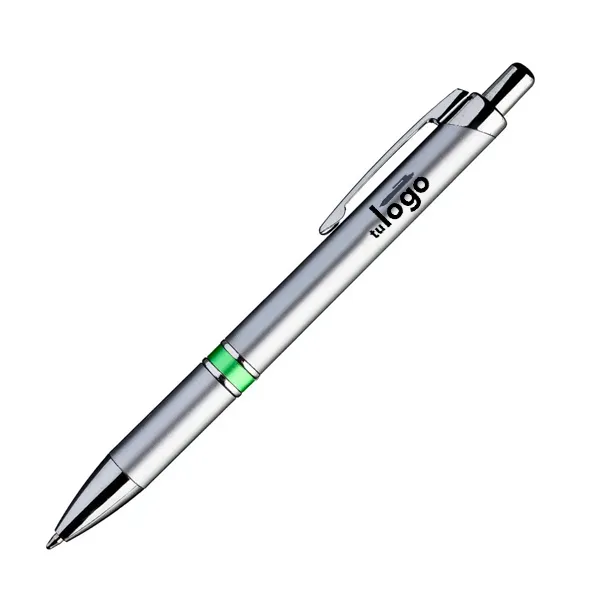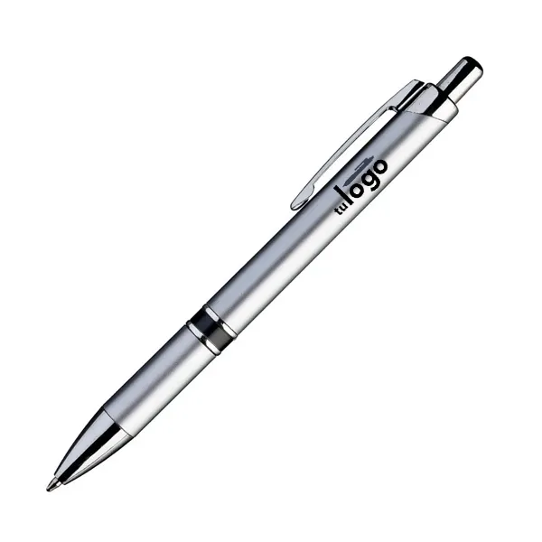 De delicadas líneas, este bolígrafo tiene dos aros metalizados brillantes cerca del grip, que lo hacen un bolígrafo ideal para obsequios de promoción elegantes. La impresión se realiza por proceso tampográfico o impresión full color con tintas UV. El área máxima de impresión de este bolígrafo (o birome) es de 7 mm. de alto x 60 mm. de largo.