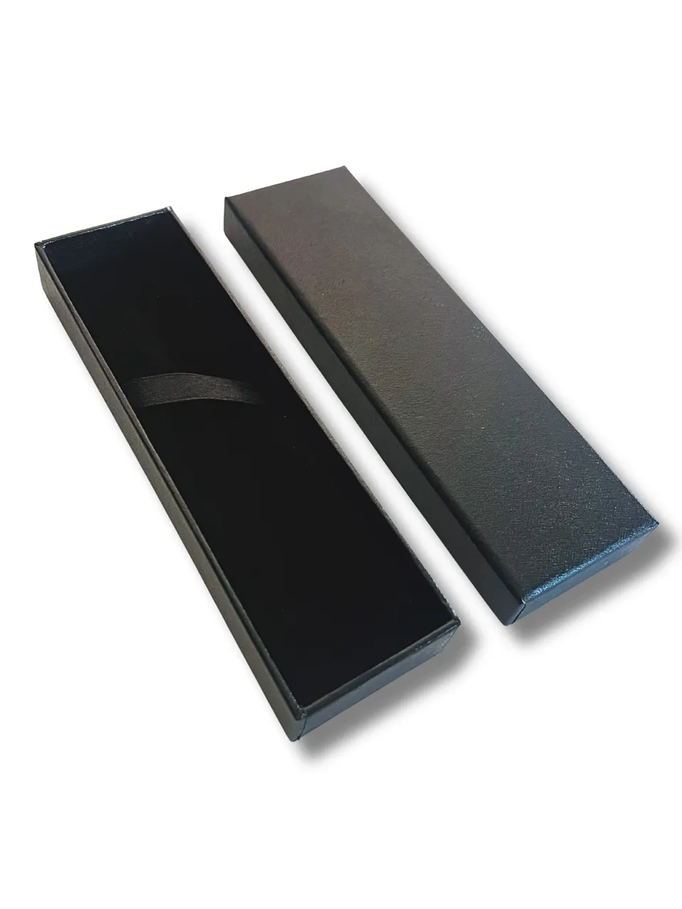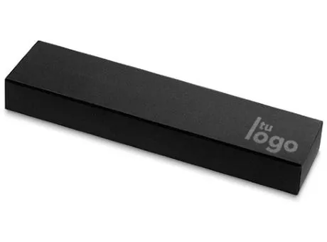 Caja rígida negra forrada, ideal para convertir cualquier bolígrafo en un regalo elegante. Personalizable con impresión UV.